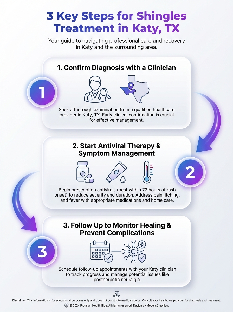 Learn the three essential steps for shingles treatment in Katy, TX, illustrated to help patients understand when to seek care and what to expect.